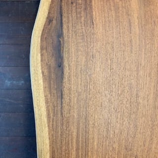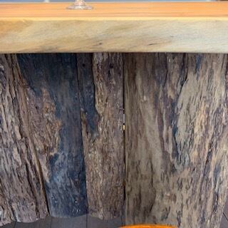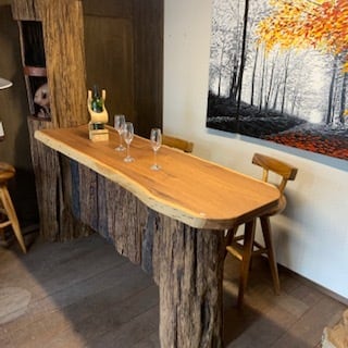 木肌を残した"チーク"と"カリン"の色鮮やかなテーブル板でできたテーブルカウンターです。