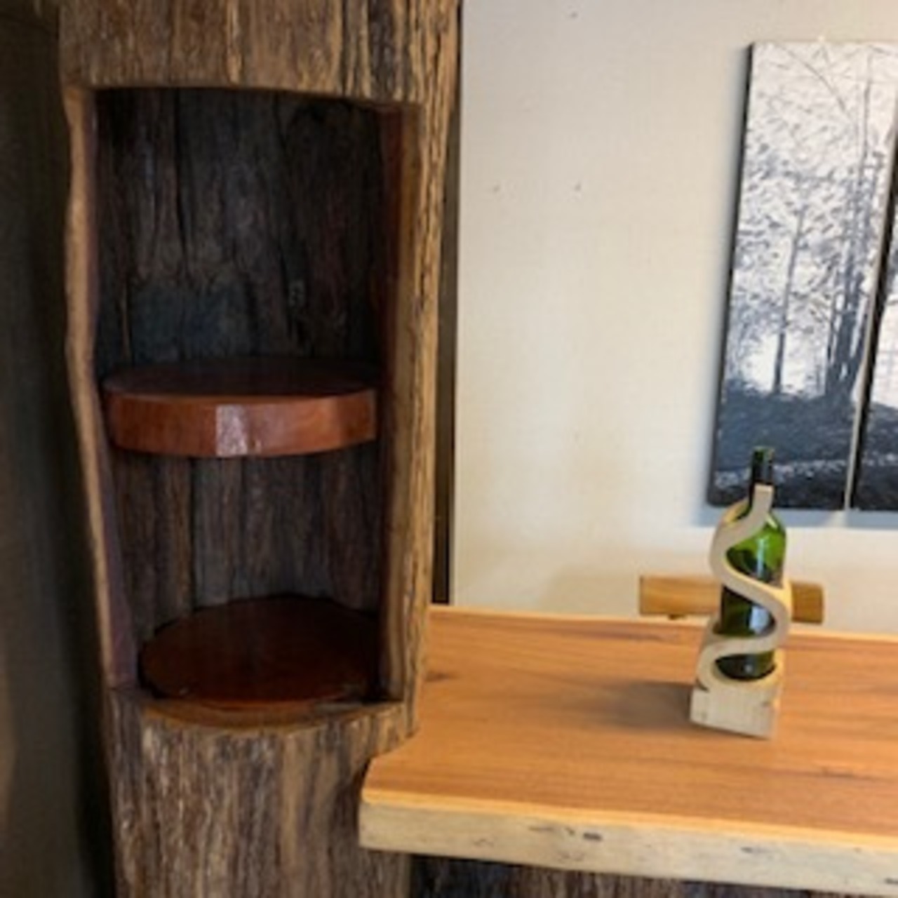 チークの柱には物を自由におけるスペースを2段作成しました。