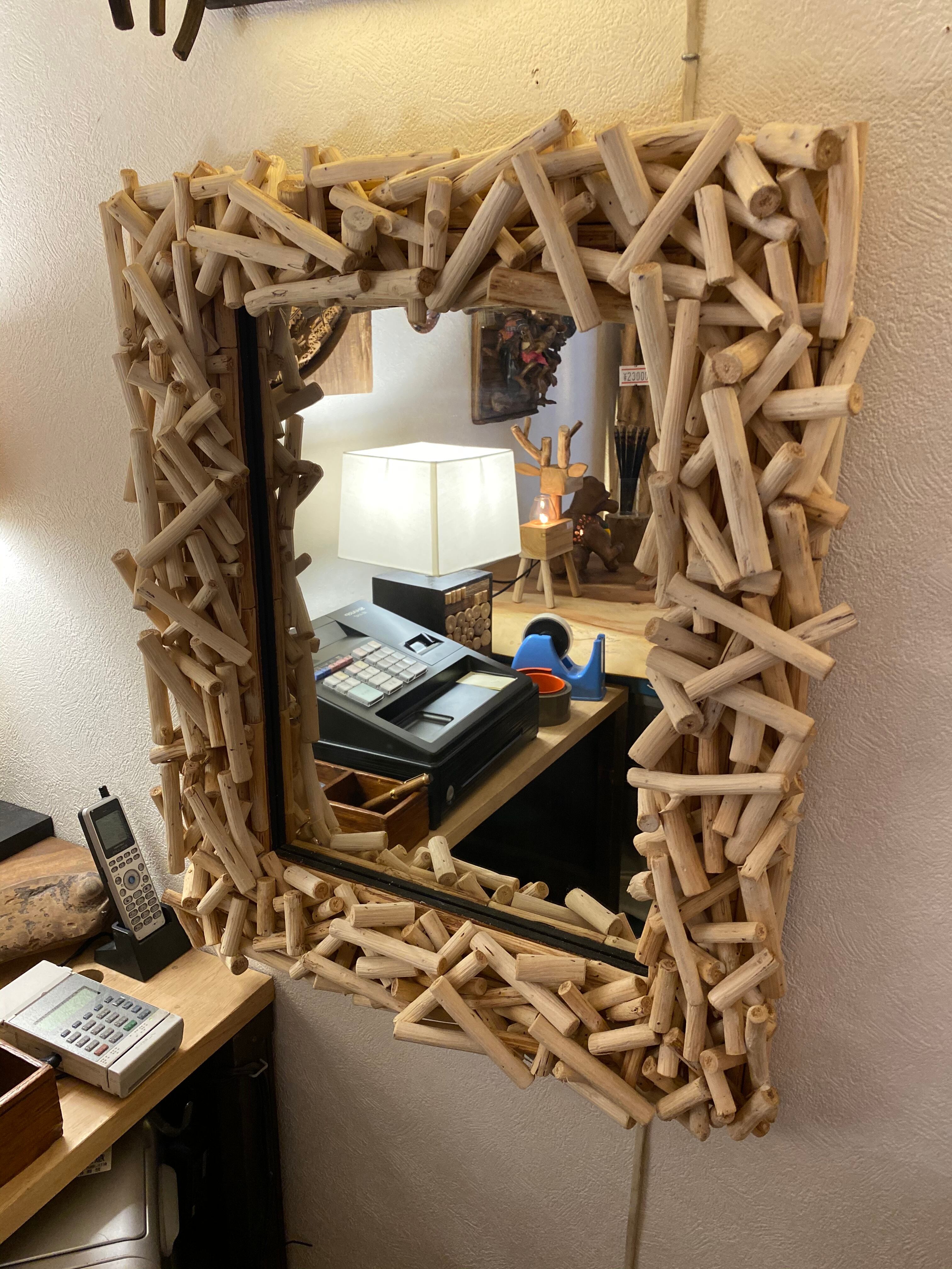 古木を何重にも重ねたフレームのデザインが目を引く壁掛けミラーです。