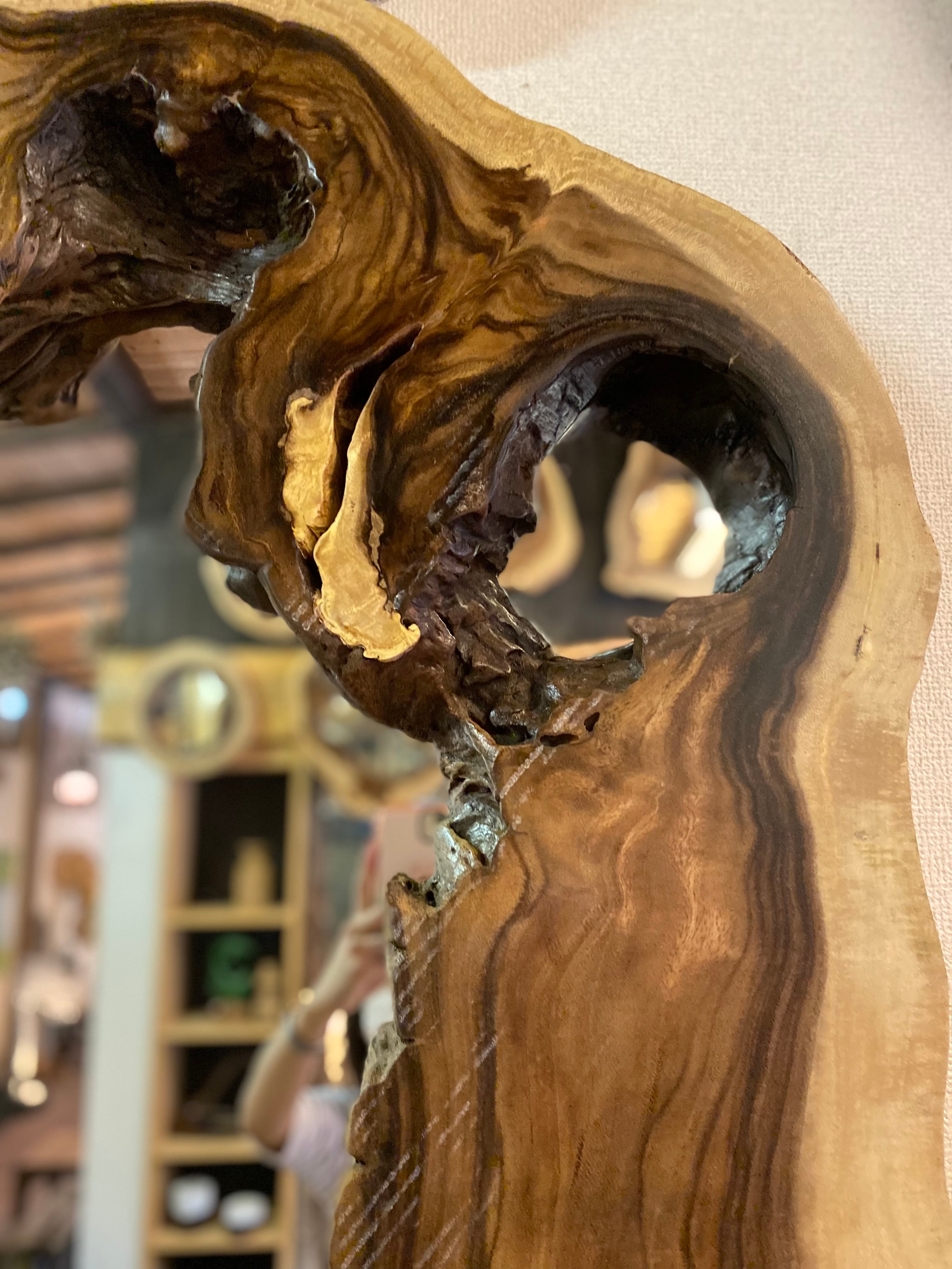 モンキーポッドの黒いラインやグラデーションに見える木目が魅力的です。無垢の木を使用してますので、世界でひとつだけの鏡です。